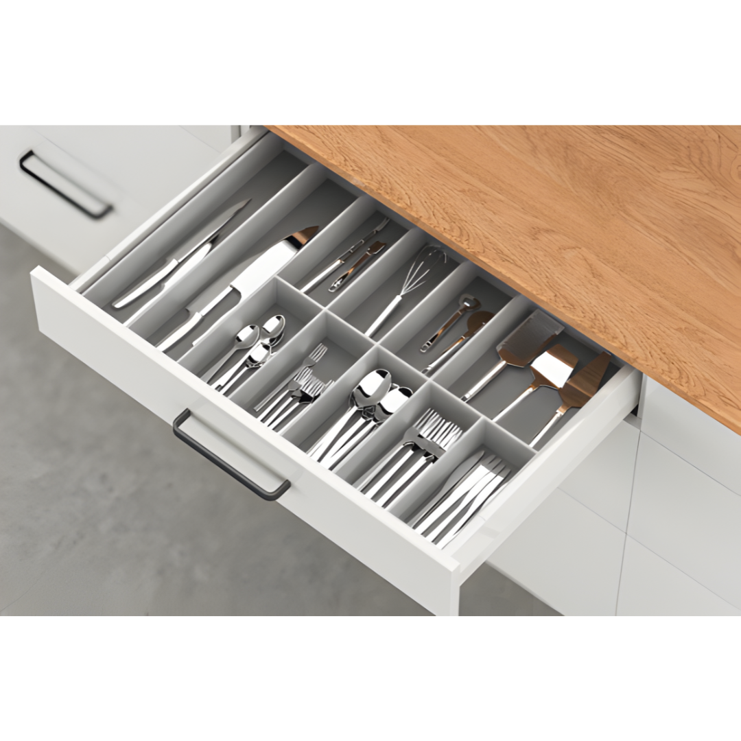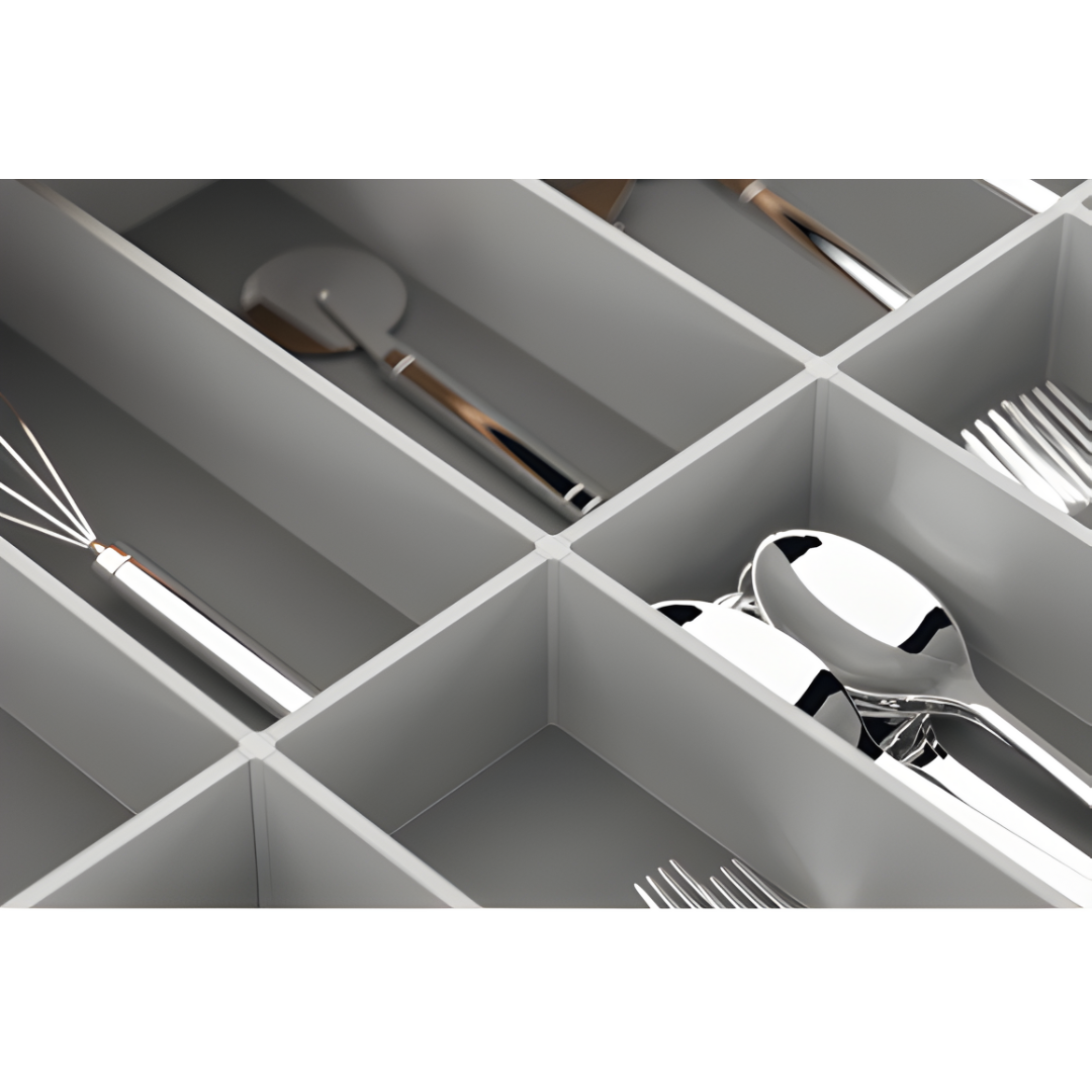 O divisor plástico da Häfele é uma divisória modular para gavetas, com dimensão nominal de 1100 × 60 mm, ideal para segmentar o interior de gavetas e melhorar a organização interna. Ele permite adaptar compartimentos internos (como em gavetas tipo “Alto Drawer”), facilitando o armazenamento ordenado de utensílios. O painel pode ser cortado sob medida e fixado por parafusos, conferindo flexibilidade e praticidade à montagem.