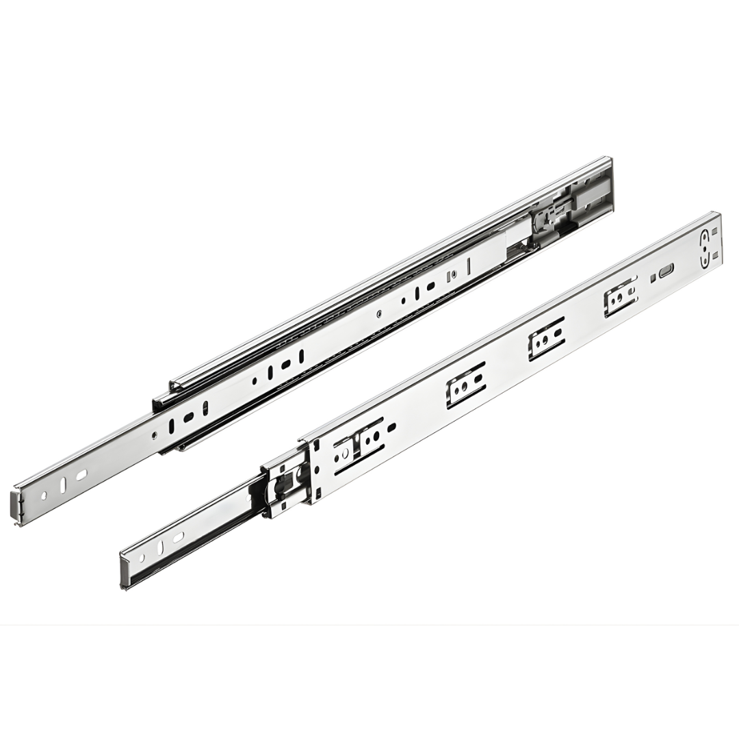 As corrediças telescópicas H45-S com abertura push da marca Häfele, possibilita a abertura total da gaveta e um fechamento suave e silencioso. Para maior praticidade, possui travas laterais que facilitam na retirada da gaveta.