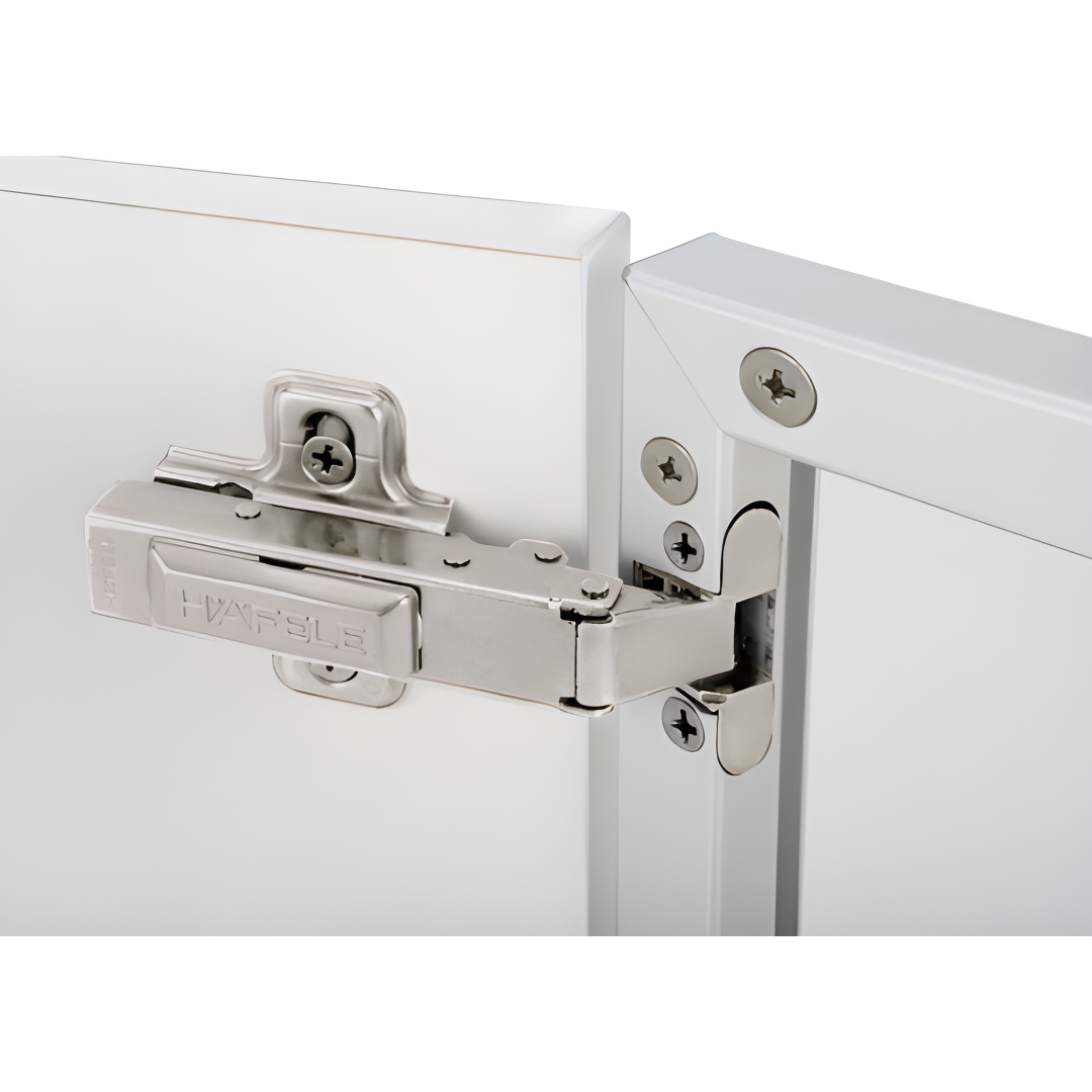 Dobradiças Metalla 330 reta 105º para portas de alumínio com Amortecedor da Häfele que oferece alta durabilidade, design discreto e movimento suave para portas de móveis. São resistentes à corrosão e têm acabamento elegante. Com sistema de calço clip e amortecedor integrado, garantem fácil instalação e fechamento silencioso.