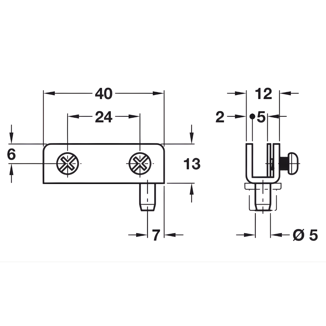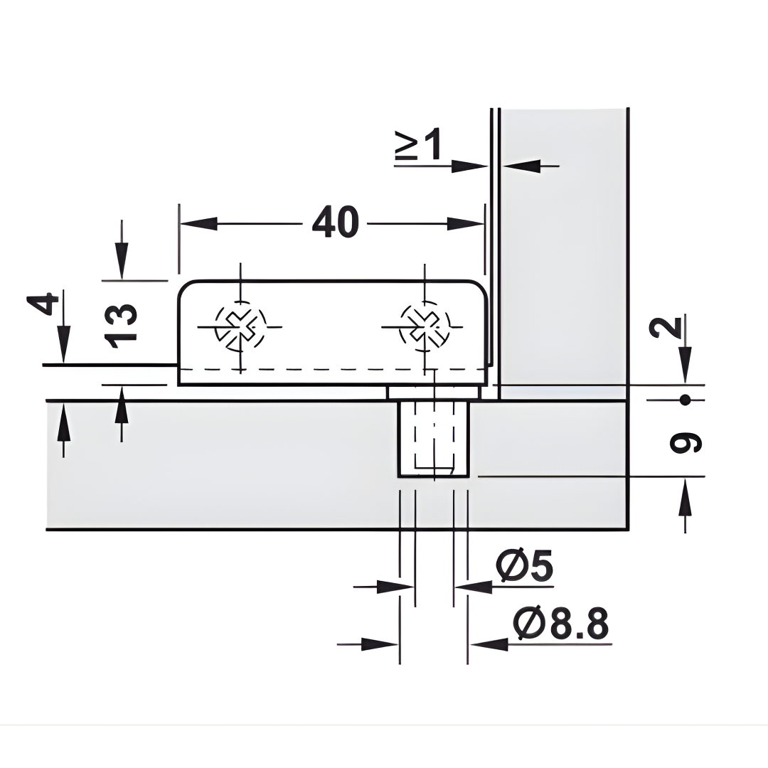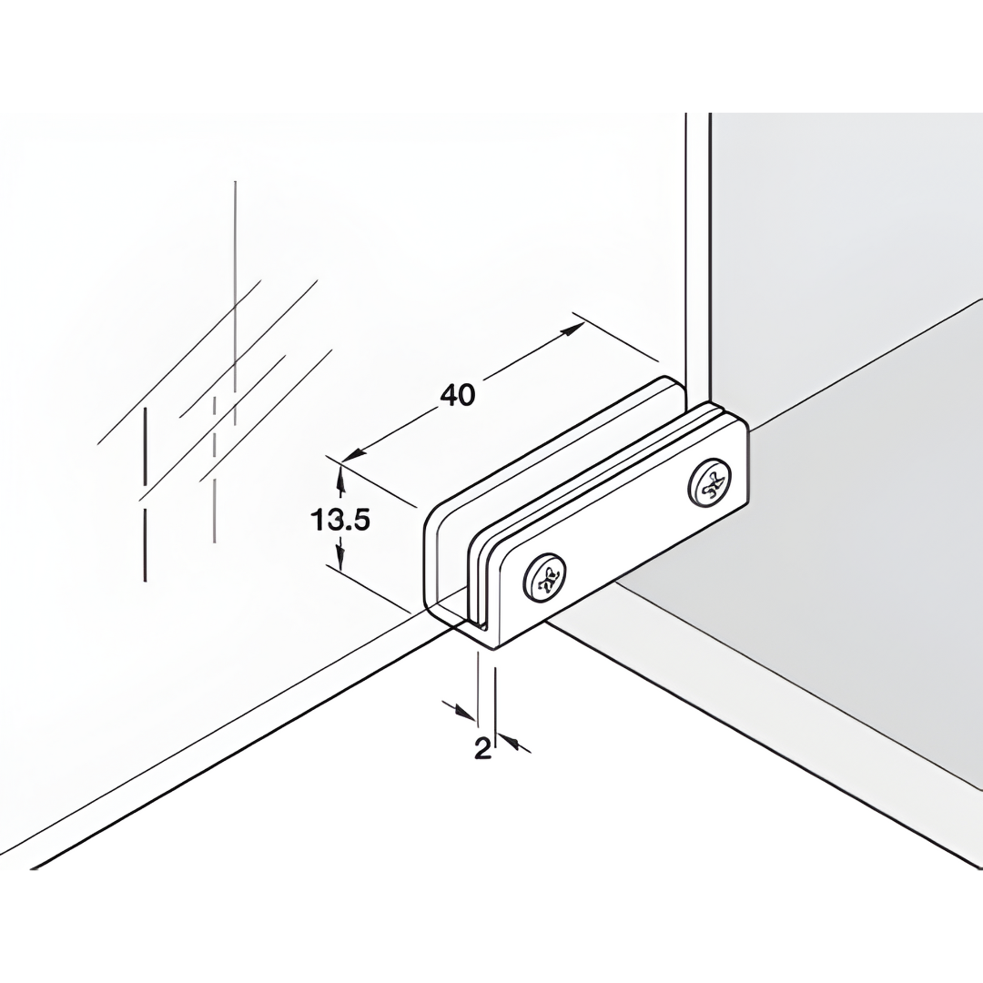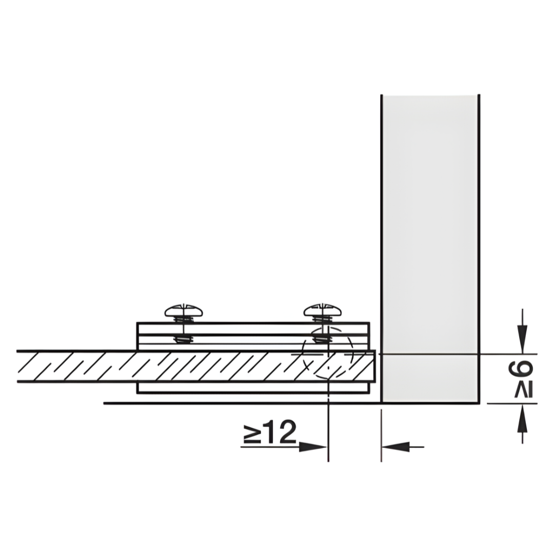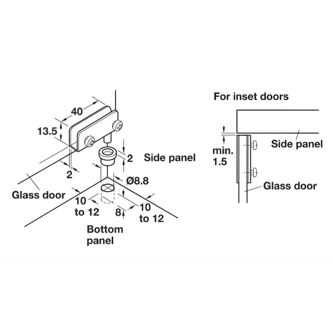 INFORMAÇÕES TÉCNICAS •Ângulo de abertura: 95º •Área de aplicação: Para portas de vidro embutidas •Material: Aço; Pivo em plástico •Montagem: Para embutir fixação do vidro por aperto •Para espessura do vidro: Máx. 4,7 MM •Para largura da porta: Máx. 400 MM •Para altura da porta: Máx. 600 MM