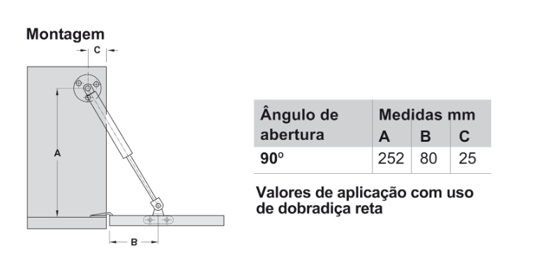 INFORMAÇÕES TÉCNICAS •Área de aplicação: Em portas basculante em madeira com abertura para baixo, para aplicação à esquerda ou à direita •Material: Aço •Acabamento: Niquelado; Corpo: branco •Ângulo de abertura: 90º •Montagem: Com encaixe em suportes pré-montados, sem ferramentas (montagem rápida)