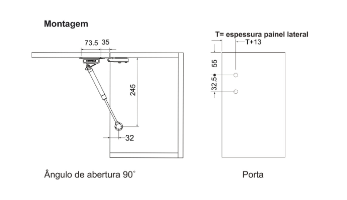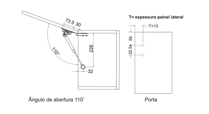 INFORMAÇÕES TÉCNICAS •Área de aplicação: Em portas basculantes em madeira com abertura pra cima, para aplicação à esquerda ou à direita •Material: Aço •Acabamento: Niquelado; Corpo: branco •Ângulo de abertura: 90º e 110° •Montagem: Com encaixe em suportes pré-montados, sem ferramentas (montagem rápida) •Altura porta: Máx. 600 mm •Largura porta: Máx. 900 mm •Peso porta: Até 5KG •Com sistema de amortecimento embutido no suporte
